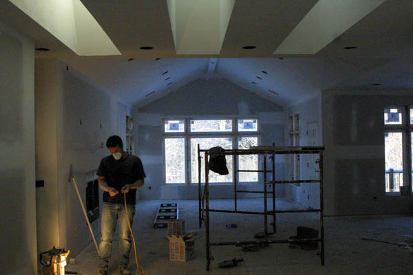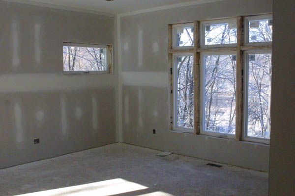 The drywallers finished today. Stippled ceilings were done yesterday and this morning they were just finishing sanding seams. Here is a picture of the master bedroom: