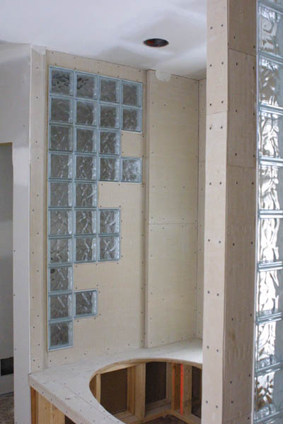 Jeff and Michael have pretty much finished the glass block wall project. Tile work will follow in this area.