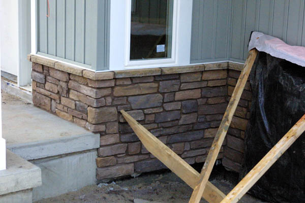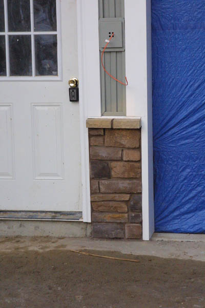 Cultured stone is being installed. The installers brought the stone, sand and mortar into the house to warm it up before installing it. I'm only posting some close-up pictures because most of the front of the house is shrouded in tarps, so the big reveal will be next week. The first shot is of the front porch: