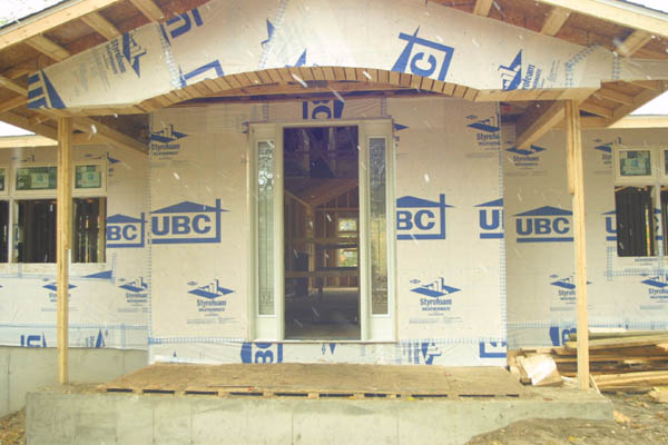The front door is installed. A construction door is in place for now, to avoid damage. Inside the house, the construction dust is swept up and the house seems very empty. The framers are pretty much done on the upper floor.
