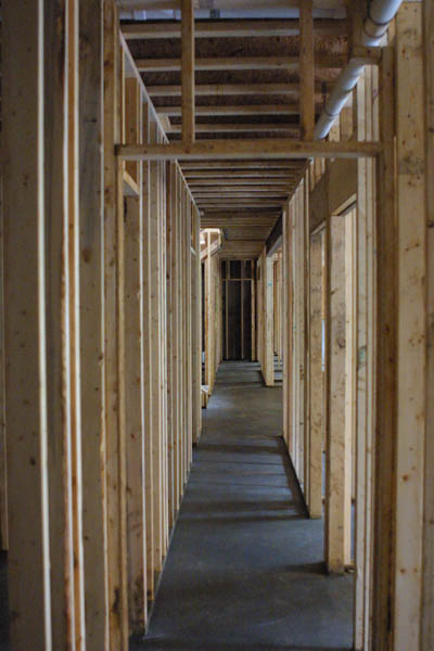 The framers were busy in the lower level today. The entire level was framed in in a day. Here is the view in the rec room from the windows looking back toward the stairs.