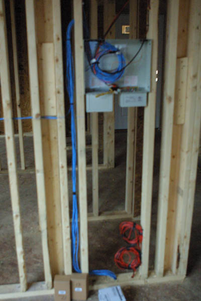 Work continues on the telecom wiring. Here is an only slightly blurry picture of the intercom master station rough in. It was getting pretty dark by the time I took this picture.