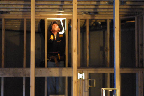 Finally, a blurry picture of Jeff at work. Dark basement equals bad pictures. You can see one of the room intercom rough-ins in the foreground on the right. Beyond it is the intercom rough-in for the Man Cave, behind Allison's room.