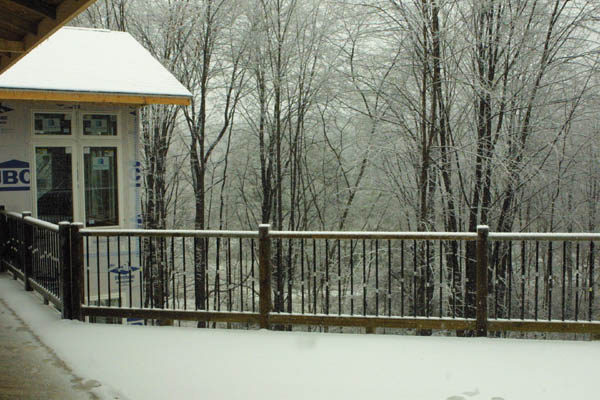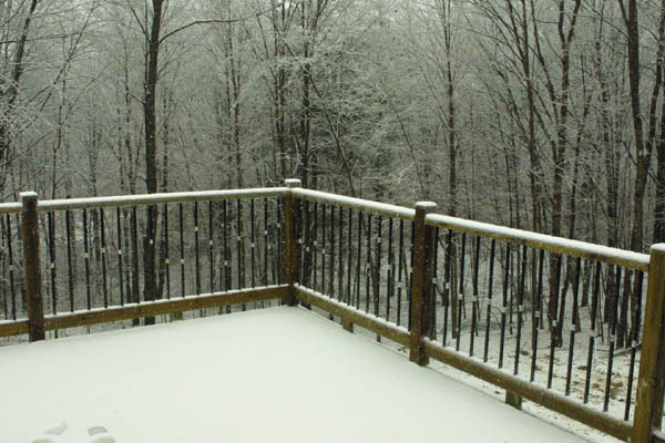 December came in with a snow storm that closed all the local schools and left a wet coat of snow on everything. Closed schools or no, I had a meeting at the house with ADT regarding the rough wiring for the house. While there this afternoon I took pictures of the deck, which is compete except for railing post ornaments.