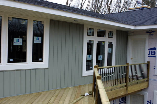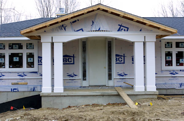 Big end of the year finale! The siding guys have started hanging siding. Of course, they started at the garage corner and won't get to the front until last, so the suspense will only build over the next week or so while they work. Before the siding shots, first let's look at the entryway trim work: