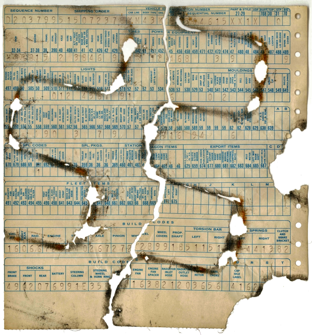 FENDER TAG DECODE (found on driver's side front fender in engine compartment, pictured above):