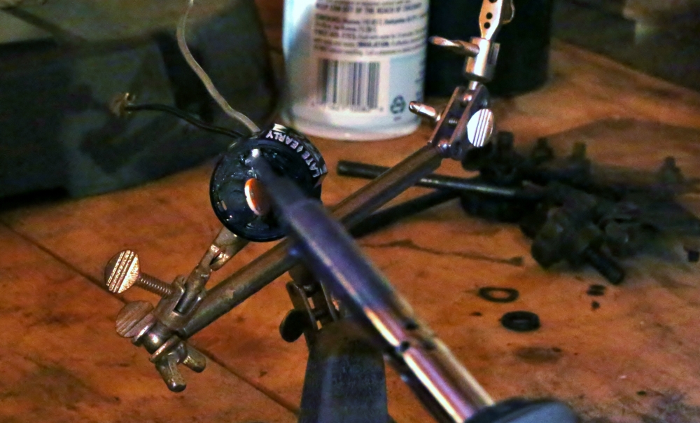 Since you have everything apart, you might as well unscrew the temp rheostat and run some tuner cleaner through it to make sure that the rheostat stays healthy. Protect your solder job by trapping the repaired wire under the clip that attaches to the light wire when you reassemble the unit. When you're done, it should look like this: