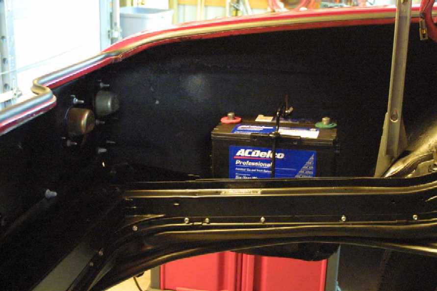 Yet further inspired by the DACC Homecoming on Saturday (as I fully expected to be), yesterday I put in a fair amount of time on the Vair. Step one was to clean up the garage, which was becoming a bit too disorderly. After that went to work on reassembling the taillights and cove trim. I am still two lenses shy on taillights, but the car looks much better with that stuff on it. I also reassembled the license plate lamp, got the latch lined up again after its return from powdercoating, took the hood rod assembly out, disassembled and cleaned it, sprayed truck bed liner stuff up on the wheel wells, and reinstalled the body to shroud seal. I had had the cover for my voltage regulator powdercoated, and bought a new cheapee one from Clarks. Drilled the rivets out of that and installed the Delco cover on the new solid state regulator.