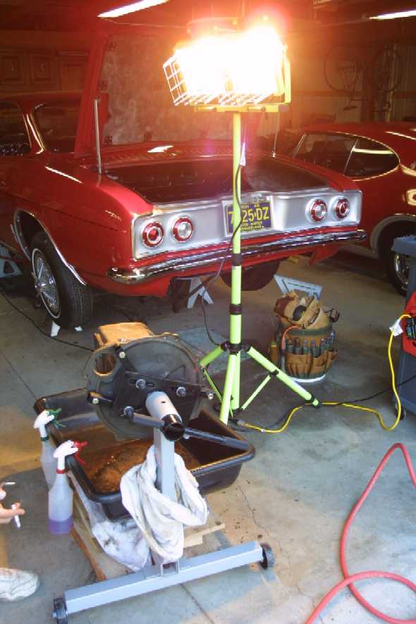 Last night we continued work on making the transaxle pretty. We got a big basin to put under the engine stand (as you can see in the picture above) and that has made work a lot easier. I think it cost $12 at Home Depot and was originally intended for the mixing of cement.