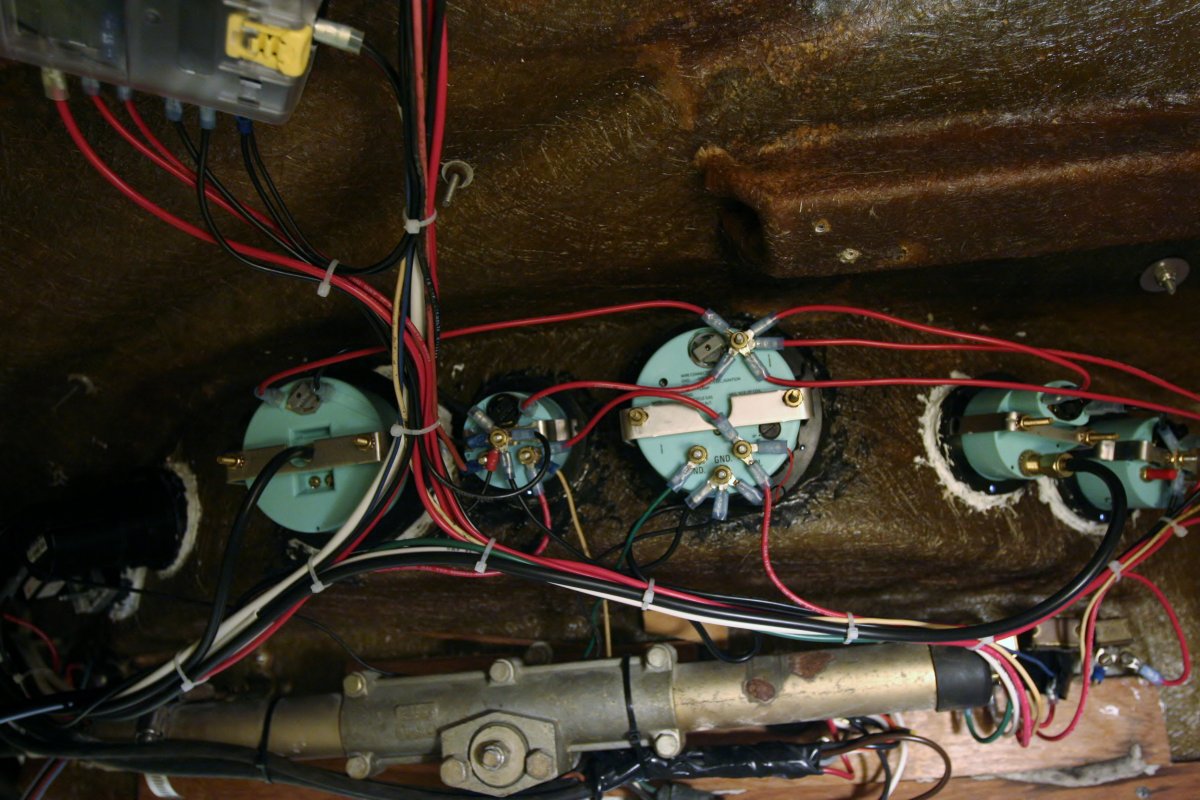 Here's a look at the completed panel. I moved the spotlight switch over to the right side of the dash near the knob for the light and added a bilge pump switch. The power trim wiring that's dangling will get cleaned up later.