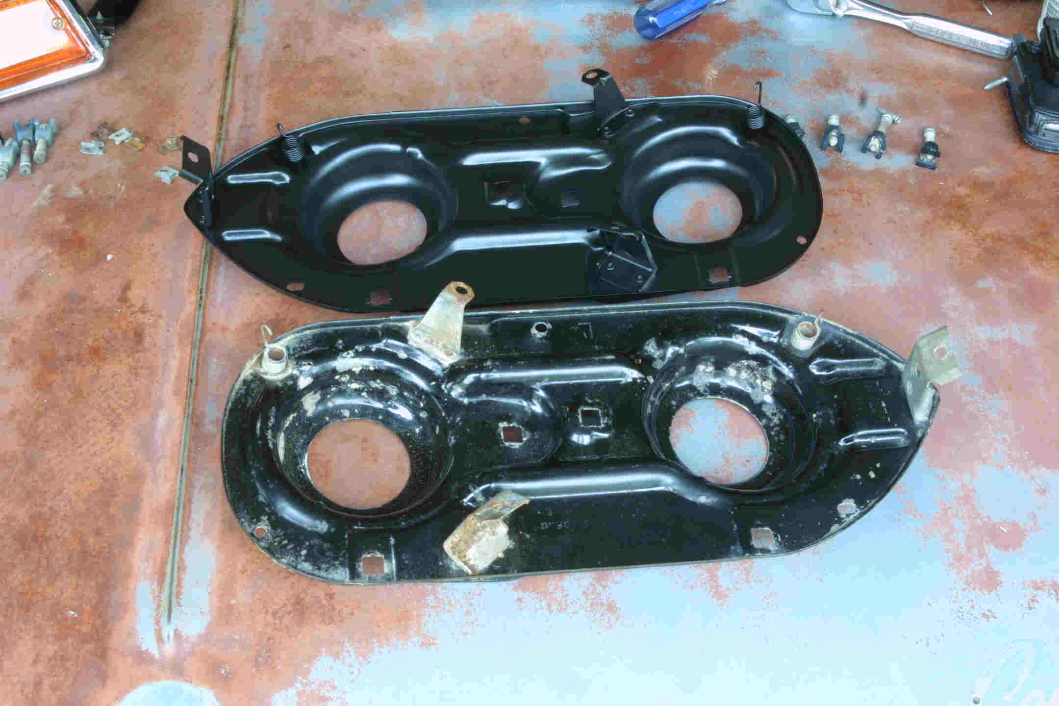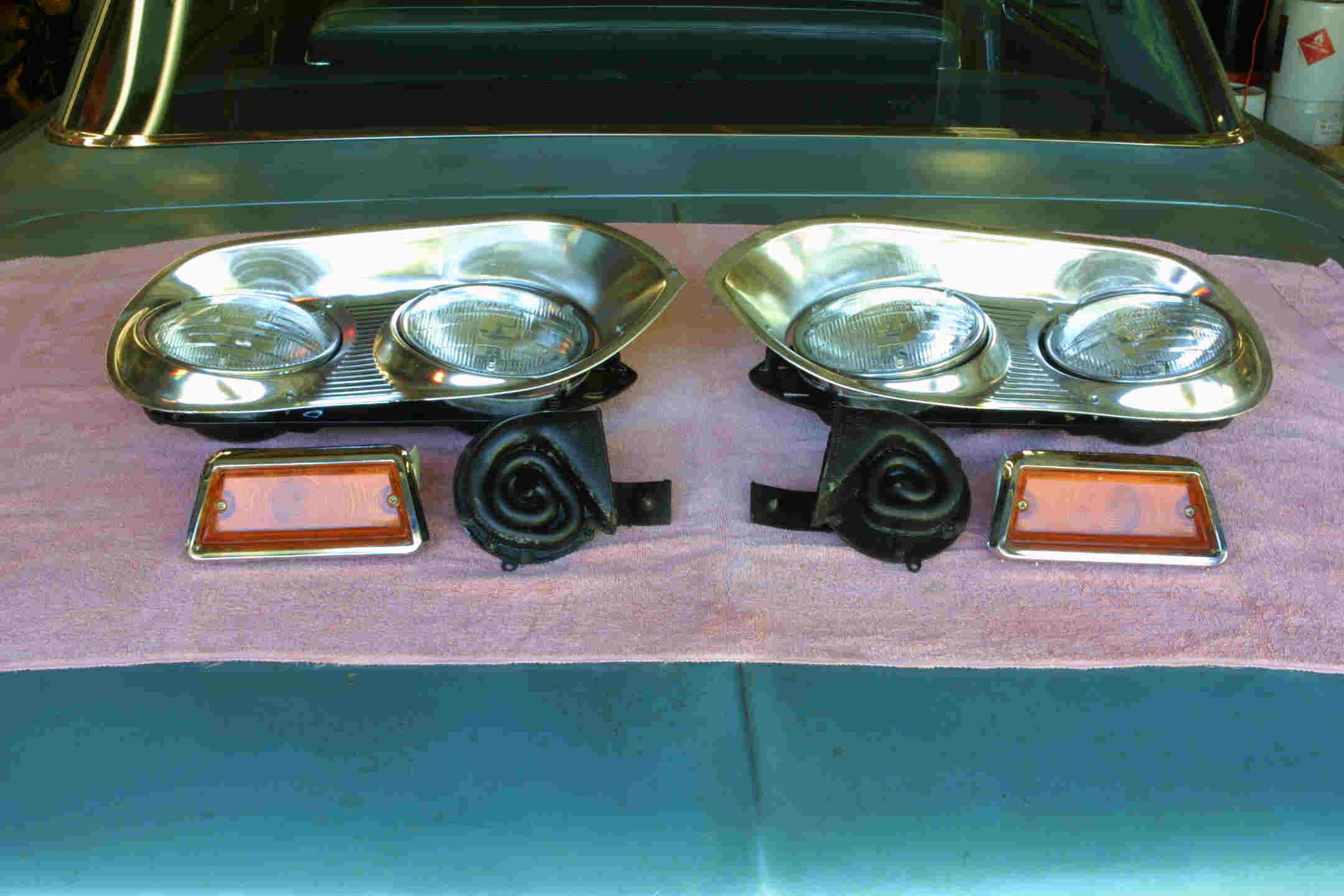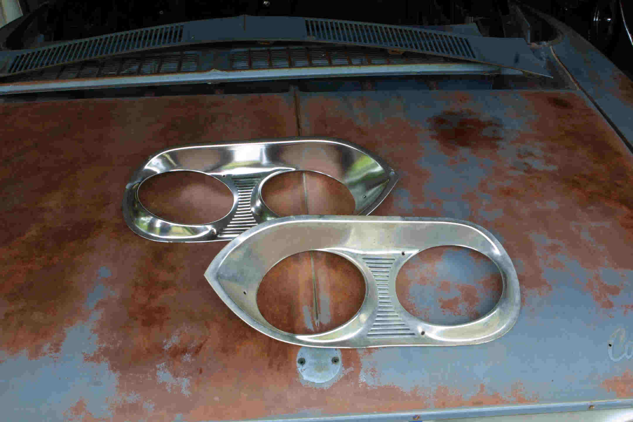 I finally got a chance to really put in some time on the convertible. This weekend I started with the front end trim. I pulled the headlight doors, and to my surprise they were in much better condition than I expected. A little bit of chrome polish and wax and they were quite presentable. Here is a before and after: