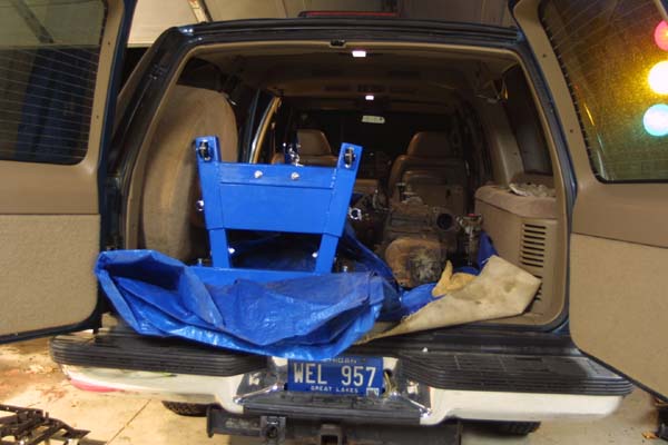 Next step was to pull the back seat out of the Suburban, put down a whole bunch of blue plastic tarps, and then wheel the powertrain into the truck.