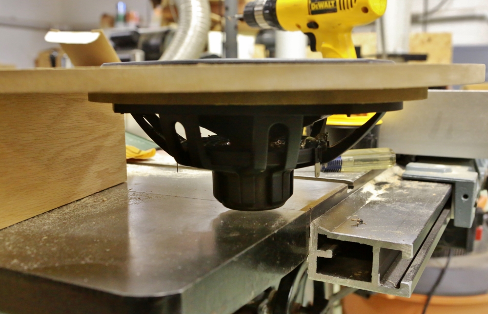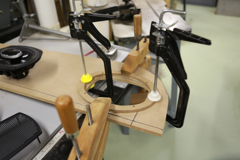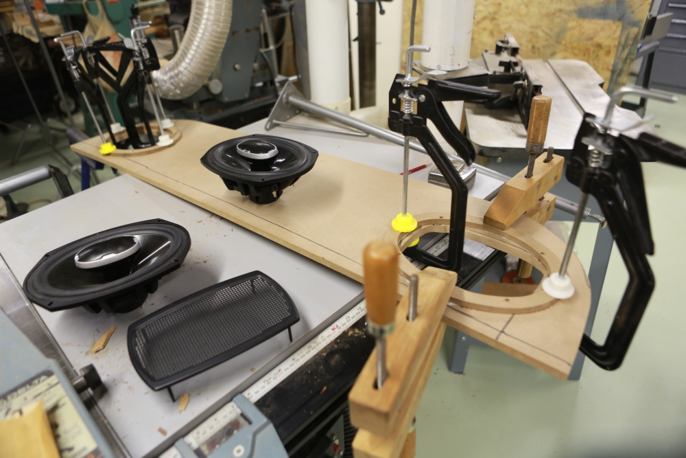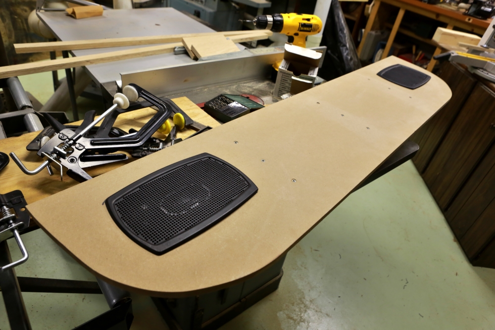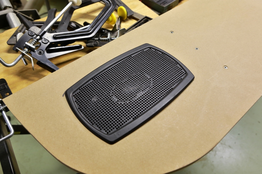 Some time ago we roughed out the shelf in MDF. Installing the speakers turned out to be far less simple than I had hoped. I bought a pair of Polk 6x9s and a pair of vintage metal grilles that came out of a Malibu or something like that. The studs on the grilles line up with the holes in the speaker frames, which you would think would be a good thing, and in the end they turned out to be. But there were a few other problems with using these grilles. First, they hole that they covered was a little smaller than a 6" x 9" oval. Second, the speakers I chose were designed for surface mount and the center-mounted mid/tweeter assembly sticks up above the mounting plane quite a bit. Finally, the studs on the grilles weren't long enough to go through the MDF and capture the speakers if a spacer was used to keep the mid/tweeter from hitting the grille.