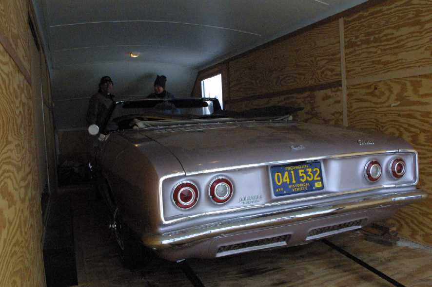 The offer I had left the seller with was $2,000 for the car as is, or $2,500 for the car in running condition. After some thought, I realized that it would be my preference to get the car running myself, since ultimately if it ran satisfactorily, I would end up owning it. I called the seller and reiterated my original offer, but added that I would be willing to do the work necessary to get it running. We agreed that if it ran satisfactorily I would pay $2,500 for the car. Having reached a deal, we set a time of 1:00 p.m. on Saturday to meet at the seller's place. WMCC member John Cole agreed to meet me there to help with the car. Jim Neal agreed to let me borrow his enclosed trailer. Friday night, Jeff, Jim and I unloaded the '67 triple black GTO convertible (sweet!) that was stored in the trailer and hooked up my Suburban to the 24' Haulmark.