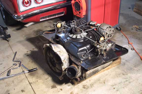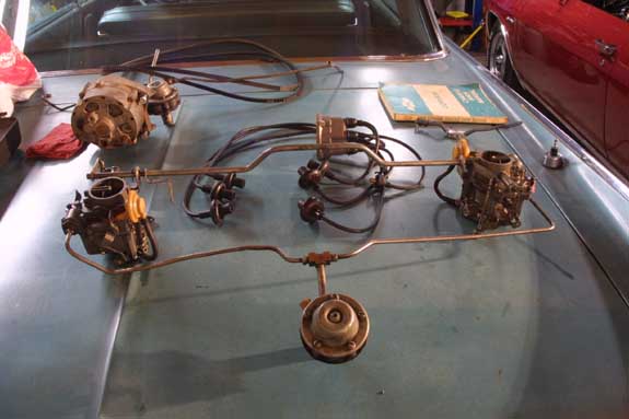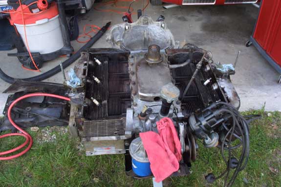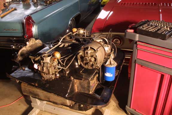 Next, I got to work on transferring the shrouding from the other motor. I removed the carbs, carb linkage and fuel pump as a unit, and did the same with the plug wires and cap, since I was going to be using the set from the old motor. Before I took the wires off I marked them with a paint pen by putting dots on the boots, one for cylinder #1, two for cylinder #2 and so forth. This worked very well.
